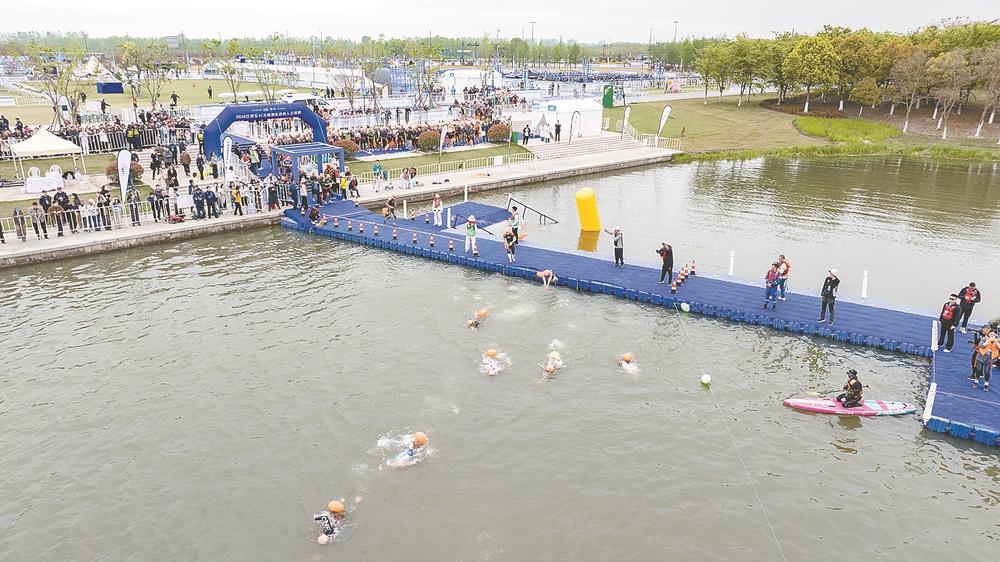 4月19日上午8時,2026江蘇鹽城大縱湖鐵人三項比賽開幕式在蟒蛇河未來水世界主舞臺舉行。